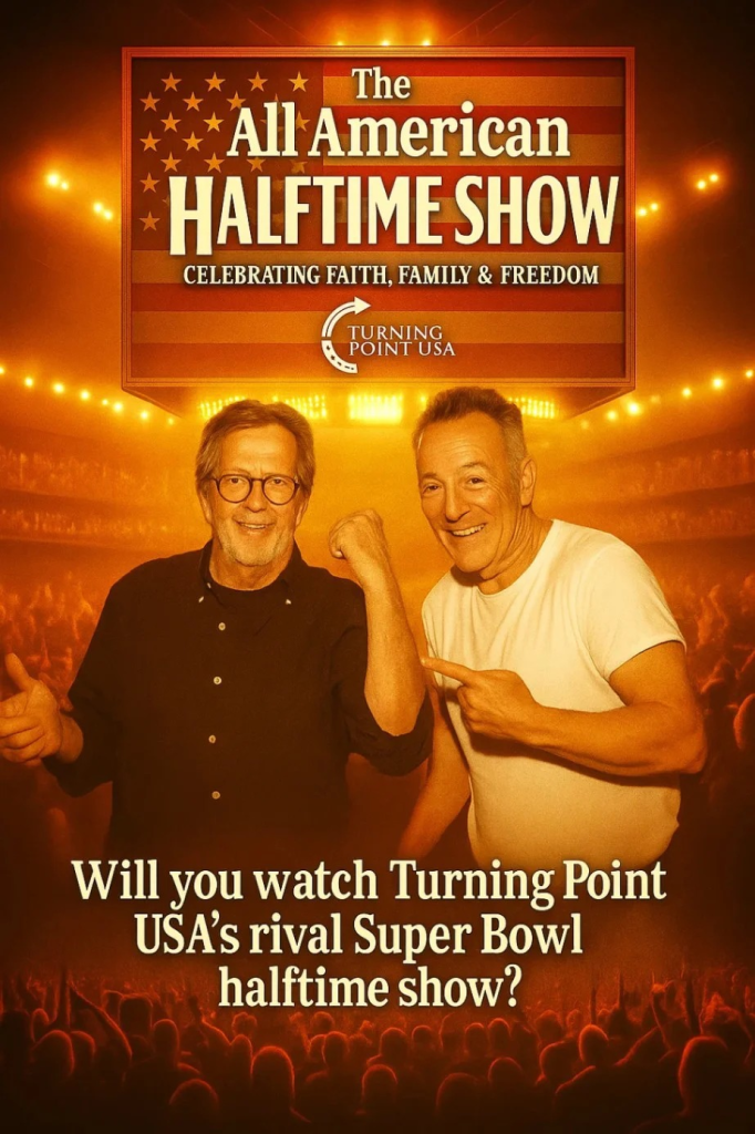 Two of the most revered names in rock history — Eric Clapton and Bruce Springsteen — have officially confirmed their joint performance at Turning Point USA’s “All-American Halftime Show,” a groundbreaking event set to air opposite Super Bowl 60. What began as a grassroots cultural experiment has now turned into a full-fledged movement — one that’s rewriting the rules of entertainment, patriotism, and the American spirit.