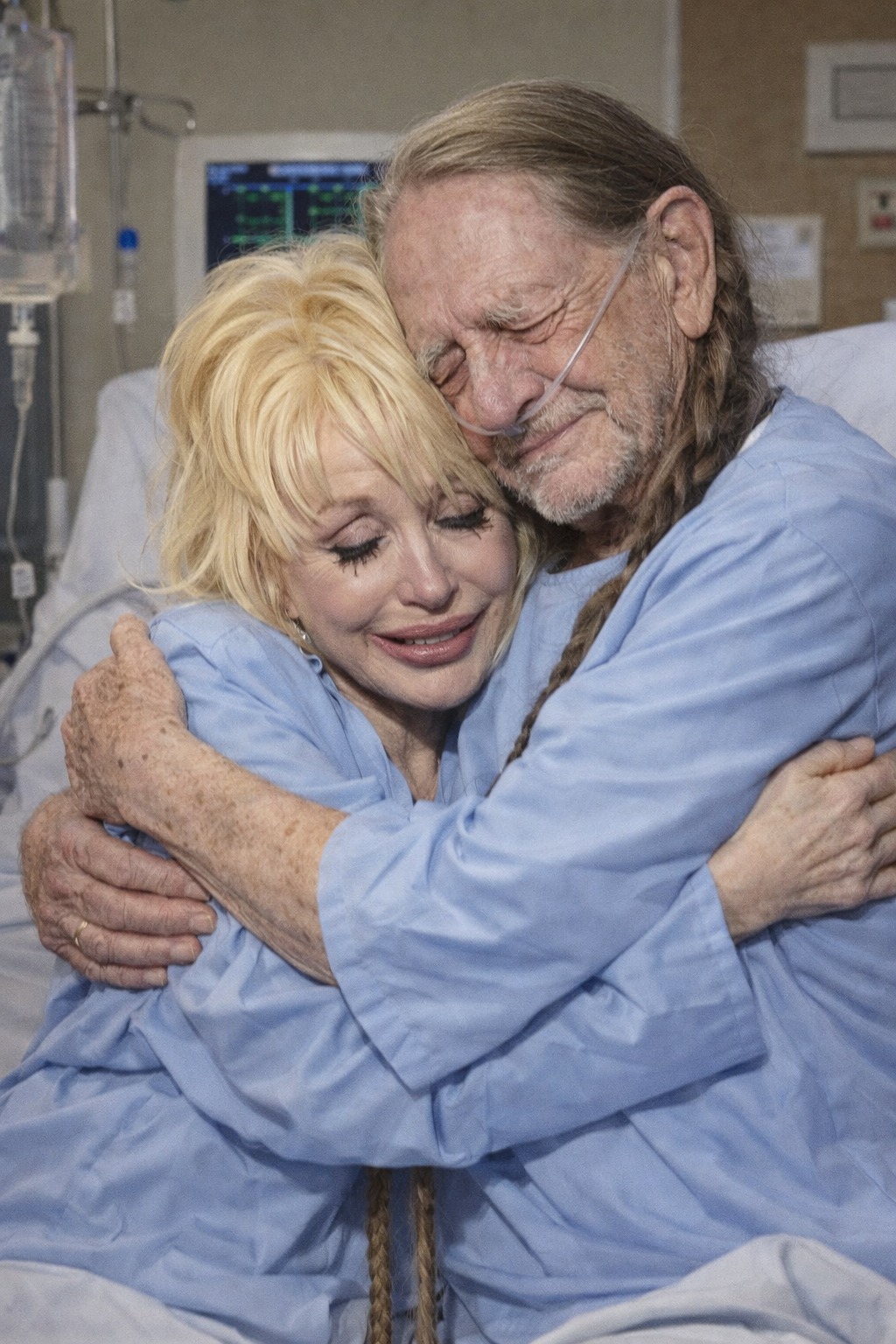 According to those close to the situation, the visit was unannounced and deliberately private. Dolly arrived quietly, escorted through back hallways to avoid attention. She wore no stage makeup, no rhinestones, no signature wigsâjust a simple coat, her hands folded tightly as if bracing herself for what she was about to feel. When she entered the room, Willie was already awake, his eyes drifting toward the window, his breathing steady but fragile.
