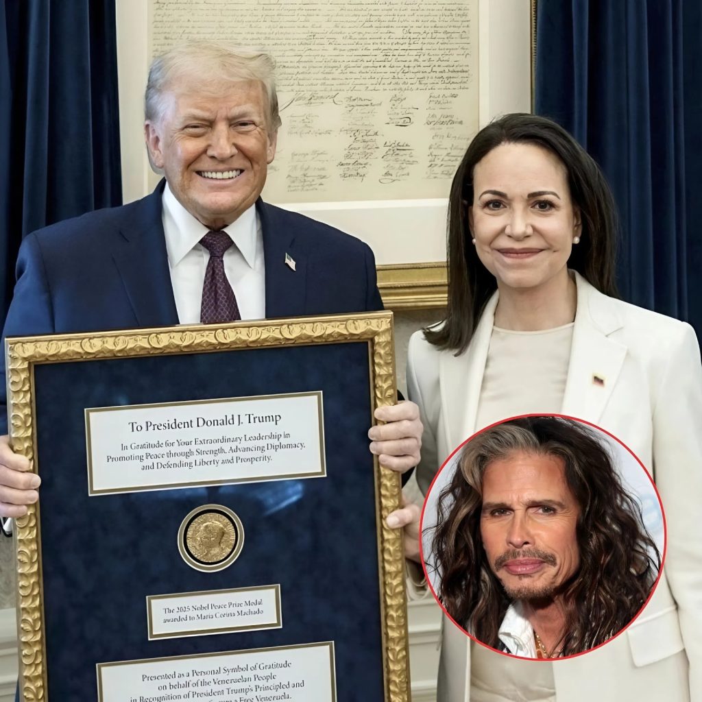 A surreal and deeply polarizing moment in which Machado, a global cultural figure whose name now dominates headlines, appeared inside the White House holding what was described as a “Nobel Peace Medal” — a gesture critics immediately branded symbolic theater, provocation, or outright mockery, depending on which side of the political divide they stood.