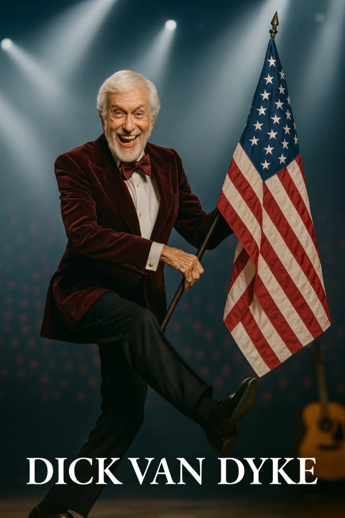 Nashville has seen legends. It has hosted icons, presidents, titans of music, and storytellers whose voices shaped generations. But nothing — absolutely nothing — prepared the audience for the moment Dick Van Dyke stepped onto that warmly lit stage, cane in hand, back straight, tap shoes glinting like steel under a battle-ready spotlight. Behind him rippled a towering American flag, stretching across the screen in deep, vibrant red, white, and blue. The entire theater stopped breathing.
