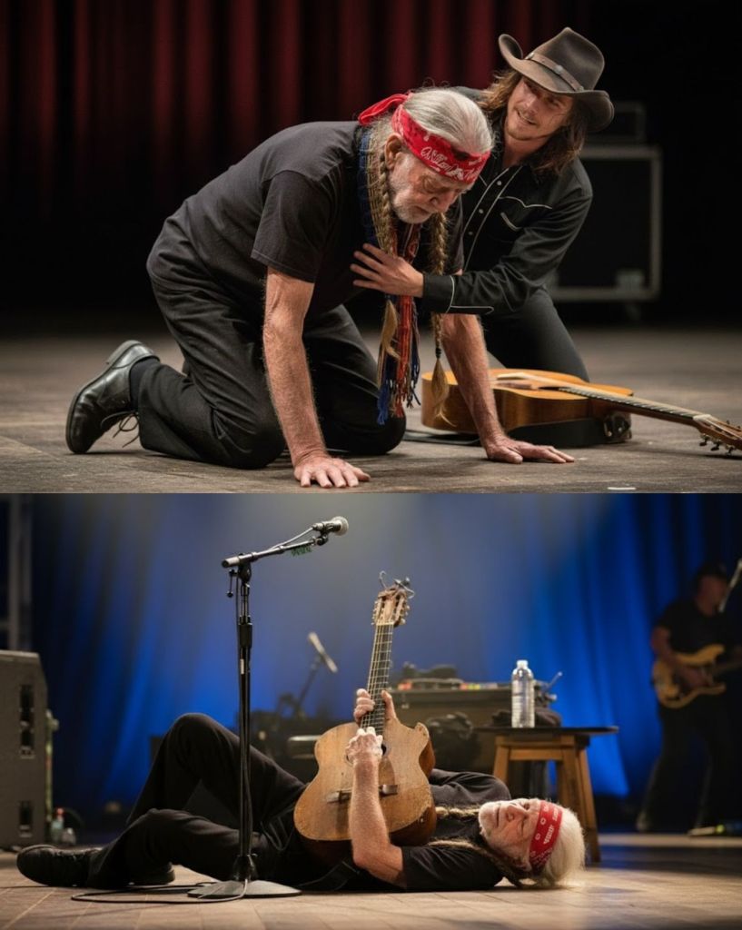 Paramedics stationed backstage rushed forward, but before they could reach him, Willie raised a trembling hand and waved them off. The crowd could see the faint smile tugging at the corners of his lips — that same calm, unshakable peace that had carried him through decades of life on the road. Lukas knelt beside him, gripping his father’s hand, the microphone still live.