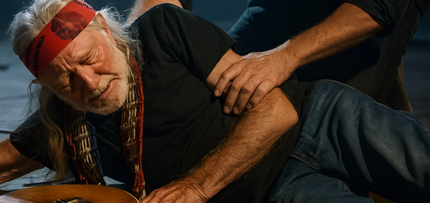 Gasps rippled through the dark as his body swayed. Lukas Nelson, standing just a few steps away, immediately moved toward his father. Before anyone could react, Willie’s knees gave slightly, and he sank onto a nearby stool — slowly, carefully, like a man laying down a burden he has carried longer than most lifetimes.