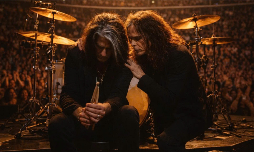 Steven Tyler didn’t take the sticks. He didn’t yell. He didn’t wave to the crowd or gesture for the music to start. He simply walked over to the man trembling behind the kit. The band had paused, and the music hung in limbo, creating an eerie vacuum that only magnified the scene. And then Steven knelt beside Joe Perry, lowering himself to the level of his friend, and placed a hand gently on his shaking shoulder.