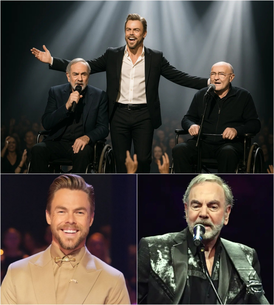 Last night in Los Angeles, the impossible became real. Under the soft, golden glow of the stage lights, three generations of artistry — Neil Diamond, Phil Collins, and Derek Hough — came together in a moment that defied time, expectation, and even reason. It wasn’t announced. It wasn’t planned for the cameras. It was something rarer — a sacred intersection of legacy and love, unfolding before a hushed, trembling audience that knew, instinctively, they were witnessing history.