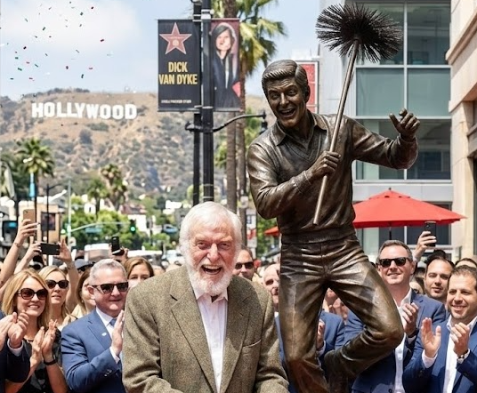In an emotional ceremony that nearly brought Sunset Boulevard to a standstill, Dick Van Dyke achieved something no entertainer before him ever had: he became the first artist honored with a full-body bronze statue on the Hollywood Walk of Fame. For more than six decades, the Walk of Fame has marked greatness with terrazzo stars embedded in the sidewalk. On this day, Hollywood looked up instead of down—and history stood nine feet tall.