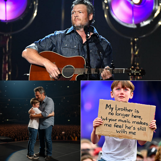 In what is now being called one of the most unforgettable performances in modern country music, Blake Shelton paused mid‑show, stepped away from the script, and opened his arms to a young fan whose pain spoke louder than any spotlight could. That fan, 10‑year‑old Daniel Carter, carried a heartache into the arena: a sign reading, “My brother is no longer here, but your music makes me feel he’s still with me.”