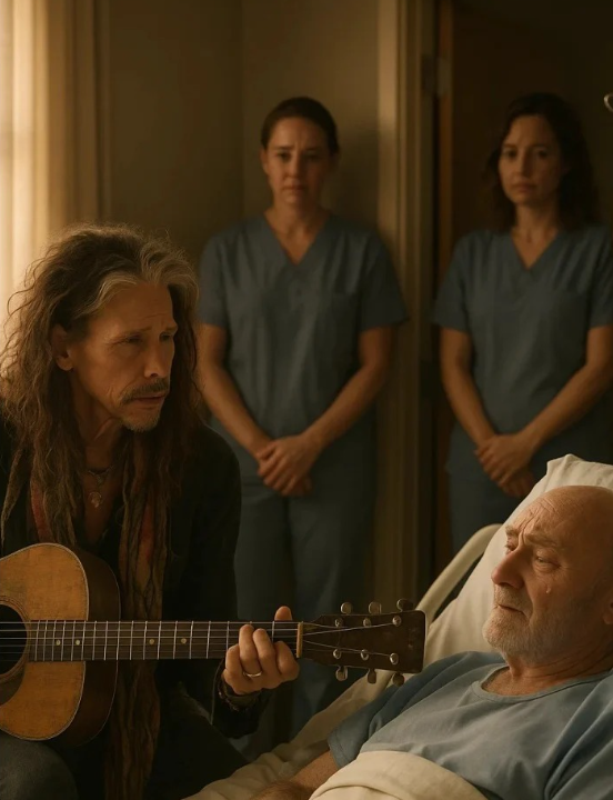 Collins, struggling, lifted his hand just slightly. His fingers tapped faintly against the blanket — a drummer’s instinct that even illness could not erase. Tyler noticed, smiled through tears, and shifted into a rhythm that gave his friend something to lean on. Two men who had conquered the world of music now shared something infinitely smaller yet infinitely greater: one guitar, one fragile hand, one unspoken conversation.