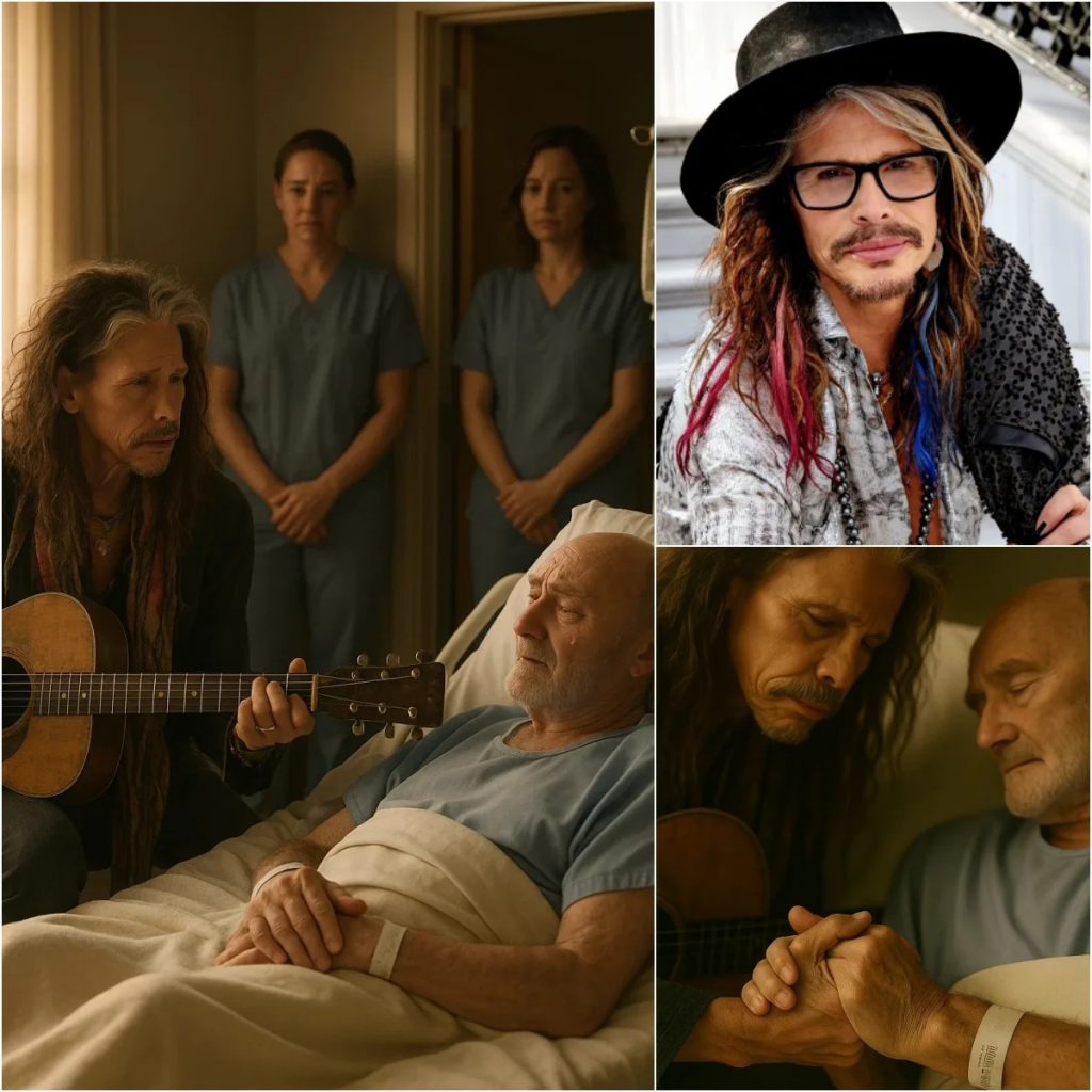 The guitar Tyler carried had stories of its own. Scratches along its mahogany frame bore witness to decades of travel — hotel rooms in Paris, backstage tuning in Tokyo, impromptu jams in New Orleans. For Tyler, it wasn’t just wood and strings; it was memory incarnate. He pulled a chair close to Collins’ bedside, lowered his head, and strummed the first trembling chord.