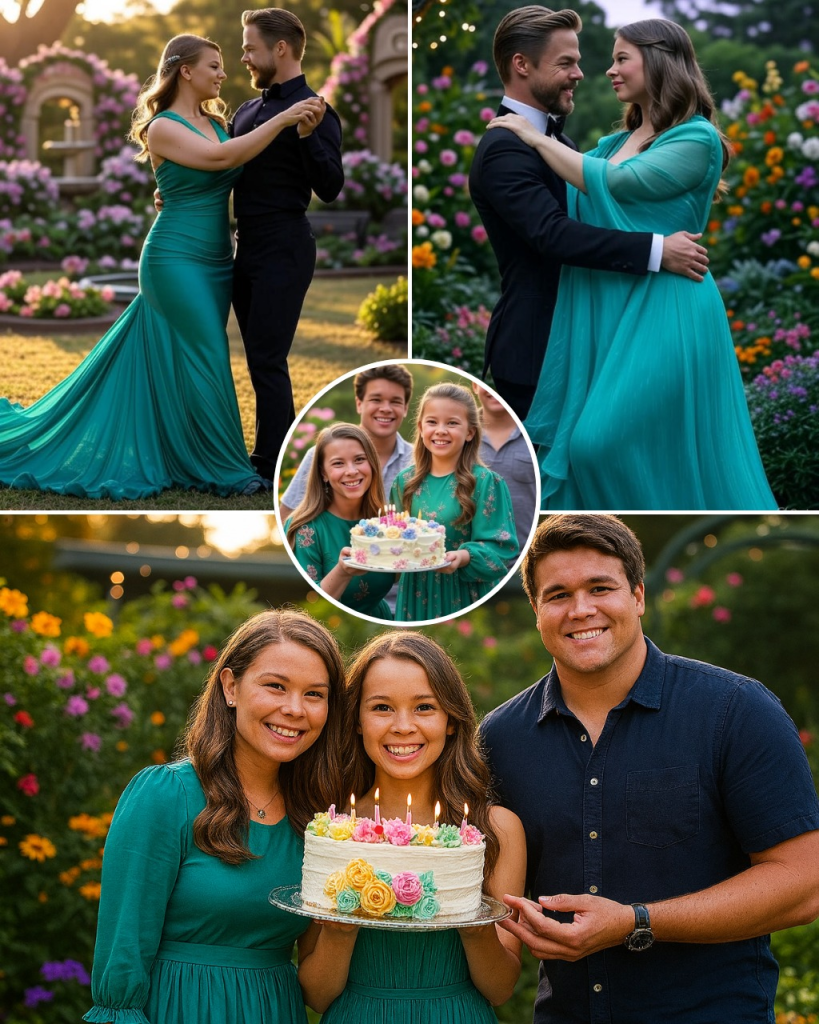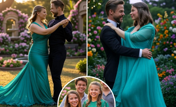 Bindi, radiant in a simple emerald-green dress, walked barefoot onto the grass. Derek Hough, the world-renowned dancer and her longtime friend through Dancing with the Stars, quietly joined her side. There was no music cue. No introduction. No crowding photographers. Just two artists — two souls — stepping into a moment that felt suspended between heaven and earth.