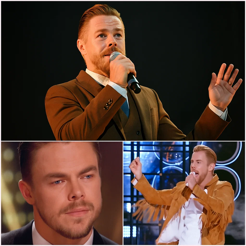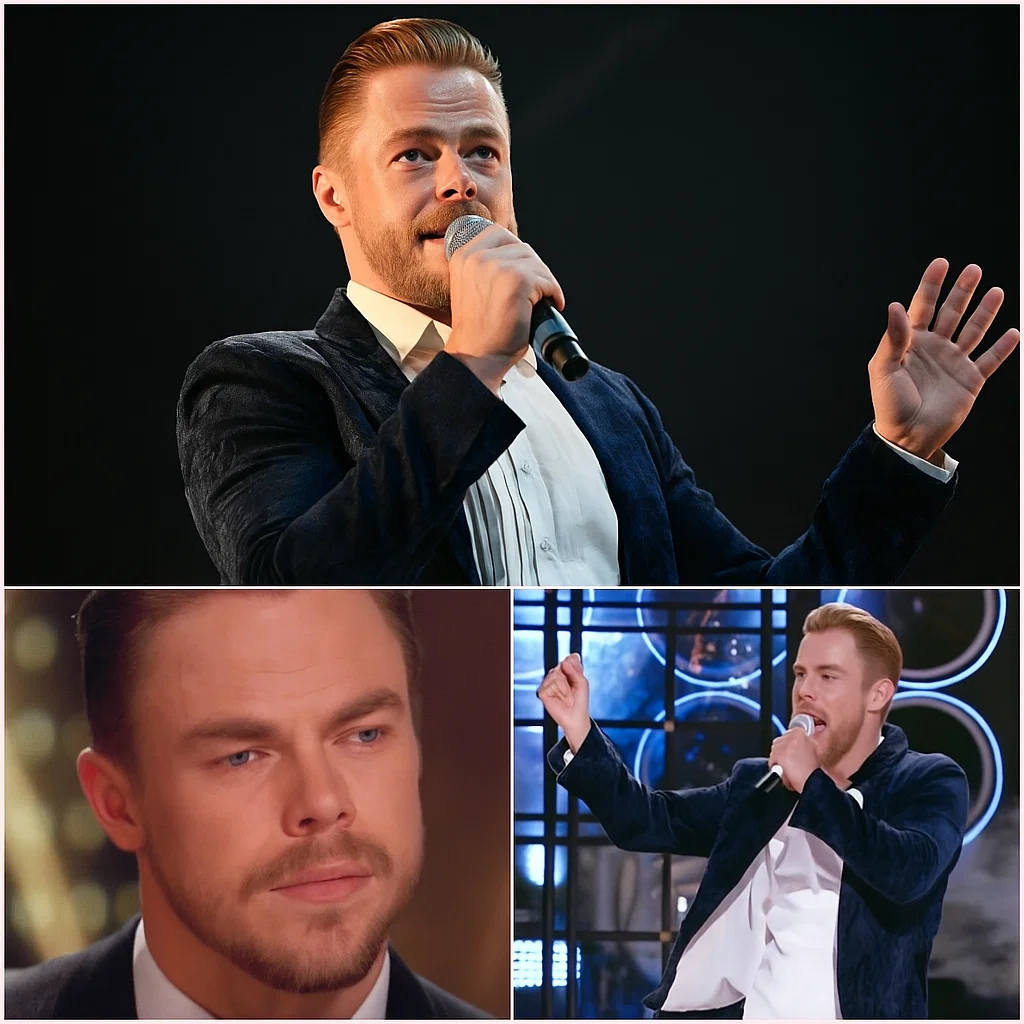 His voice — calm, steady, clear — filled the air. No dancers. No lights. No band. Just Derek Hough, standing alone in a single spotlight, offering music where others might have offered anger.