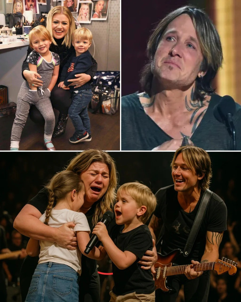 Cameras panned to Kelly Clarkson, sitting near the front of the stage with her two youngest children, Remy (9) and Rose (7). She laughed nervously, unsure what Keith had planned. Then, the lights dimmed, and something truly unforgettable began.