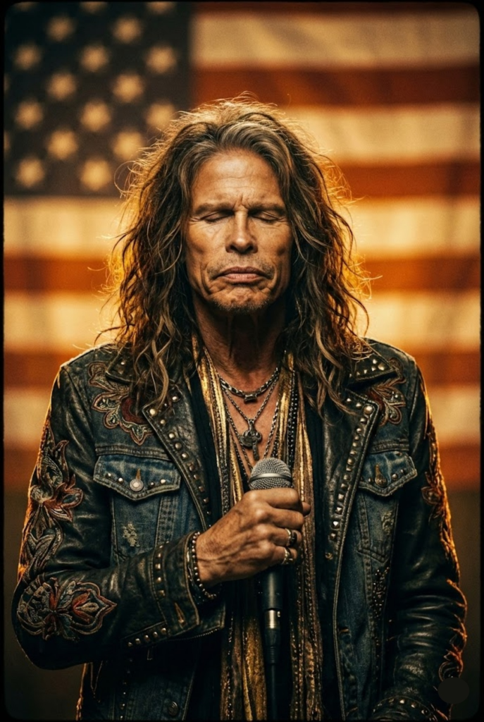 As the band eased into silence, Tyler slowly walked to the edge of the stage. No spotlight cue. No dramatic announcement. Just a man and a microphone. He placed his hand over his heart, closed his eyes, and after a breath that felt like it stretched across decades, he began to sing: