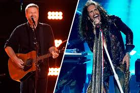 Then, as the screen fades to black, the first notes of a guitar ring out. Blake Shelton steps onto the stage, his silhouette framed by flames and smoke, launching into a rousing version of “God’s Country.” Moments later, the unmistakable shriek of Steven Tyler’s voice cuts through the air — and just like that, the two worlds collide.