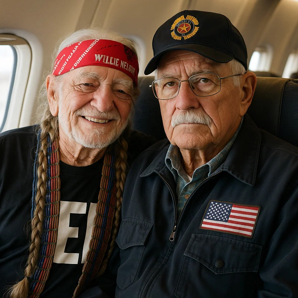 Somewhere on Flight AA245, a veteran sat by the window in first class, staring at the endless horizon. And somewhere behind him, Willie Nelson sat quietly, strumming invisible chords against his knee, smiling out at a nation he still believes in — a nation built not on wealth, but on kindness.