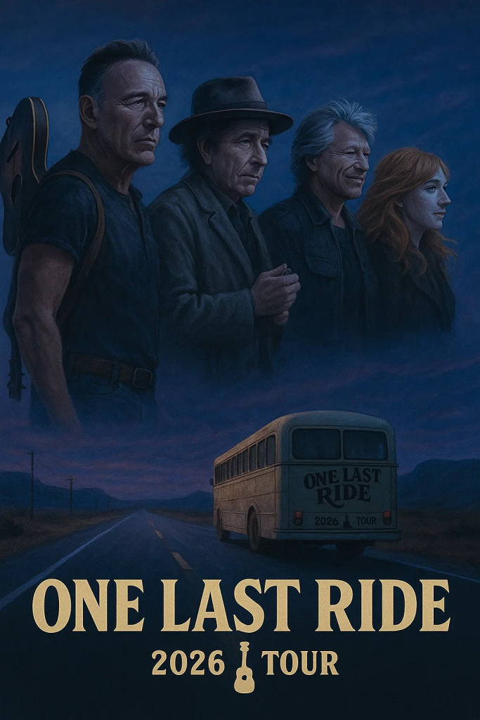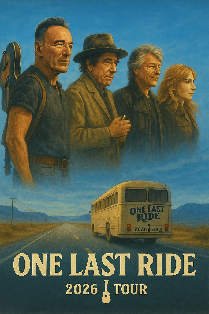 In an announcement that has sent shockwaves through the global music community, four of America’s most legendary figures — Bruce Springsteen, Bob Dylan, Jon Bon Jovi, and Patti Scialfa — have officially confirmed what many are calling the most emotionally charged and historic tour of the century. The 2026 world tour, titled “One Last Ride,” is not merely a series of concerts — it’s a living monument to the spirit, grit, and poetry that defined American rock for generations.