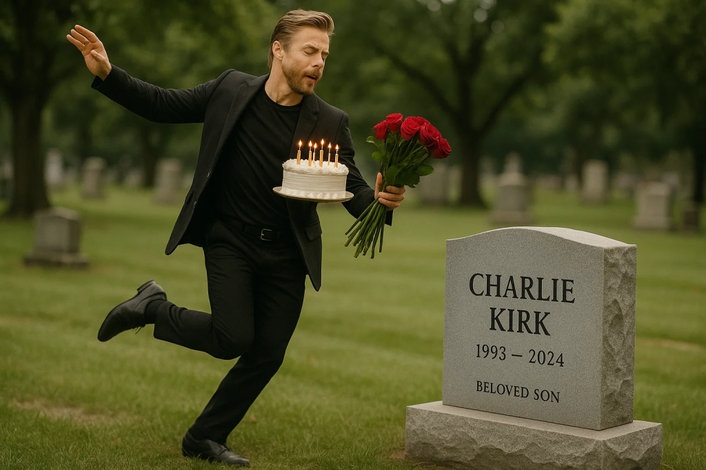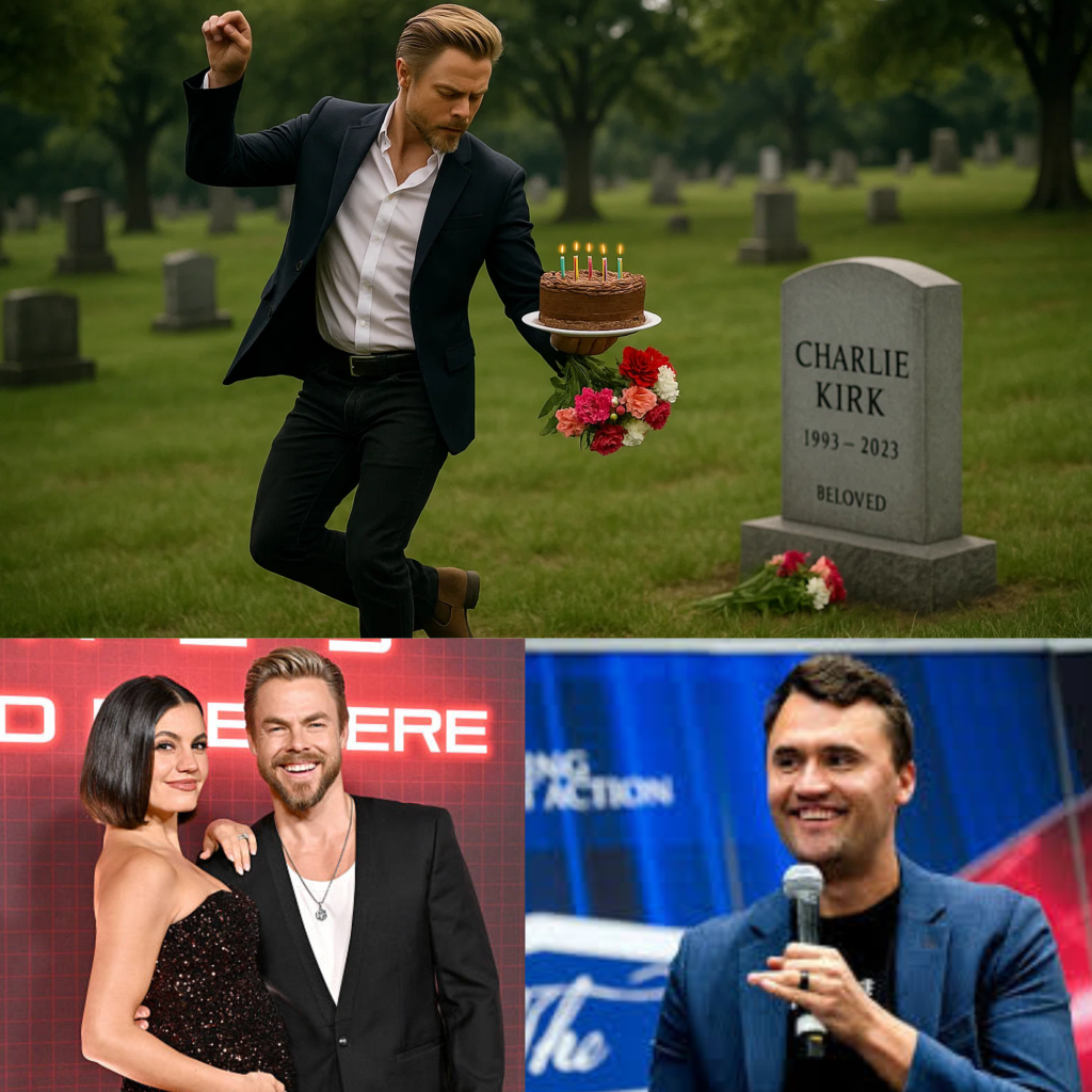 On this morning, Derek Hough stood alone at the edge of eternity. No crew, no entourage, no applause. Only the gentle rustle of leaves, the smell of damp earth, and a single white candle glowing beside the grave of his late friend — Charlie Kirk.