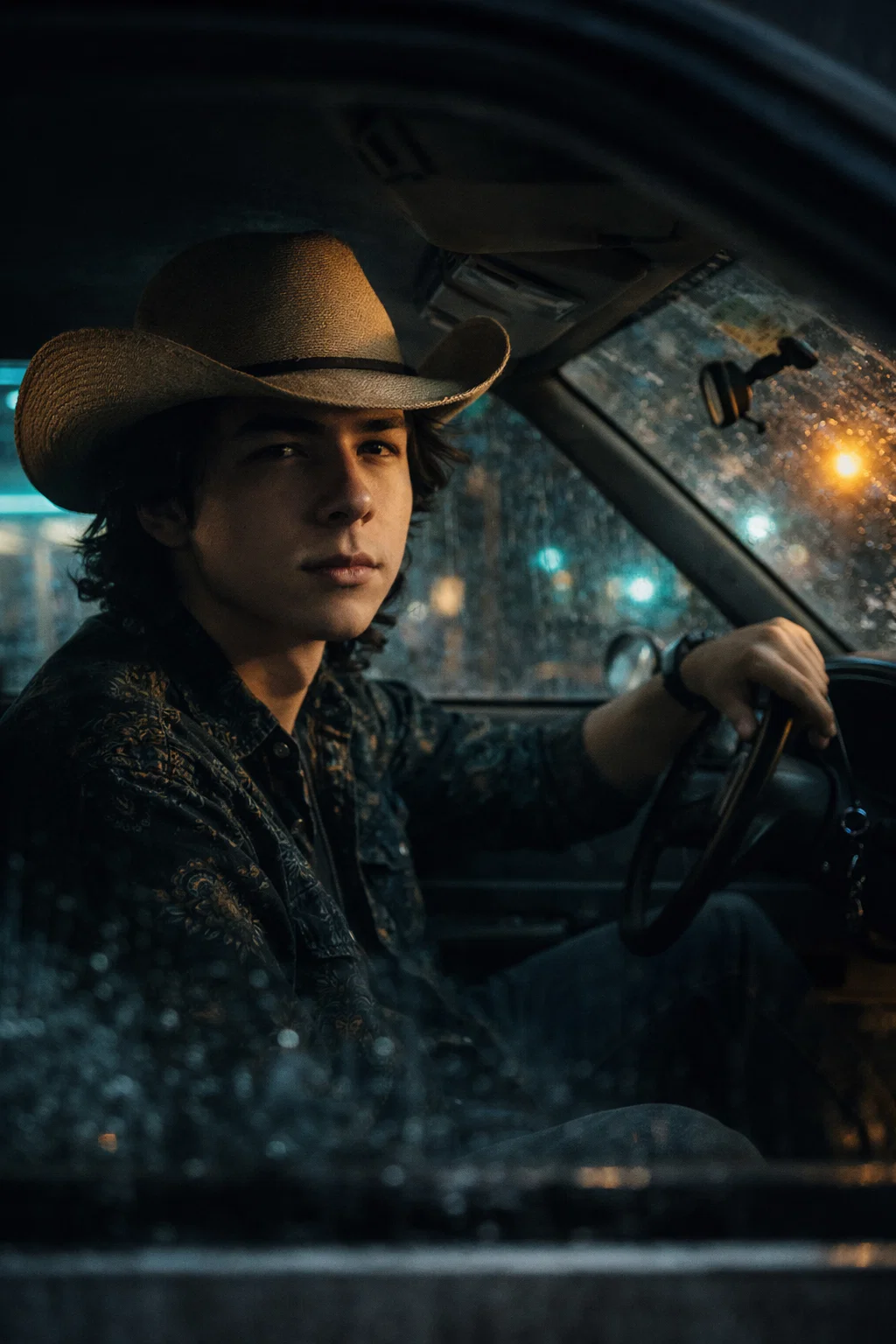 The engine was running, though it didn’t need to be. Rain tapped softly against the windshield, turning the world outside into a blur of light and shadow. Inside, it was quiet — except for one thing.