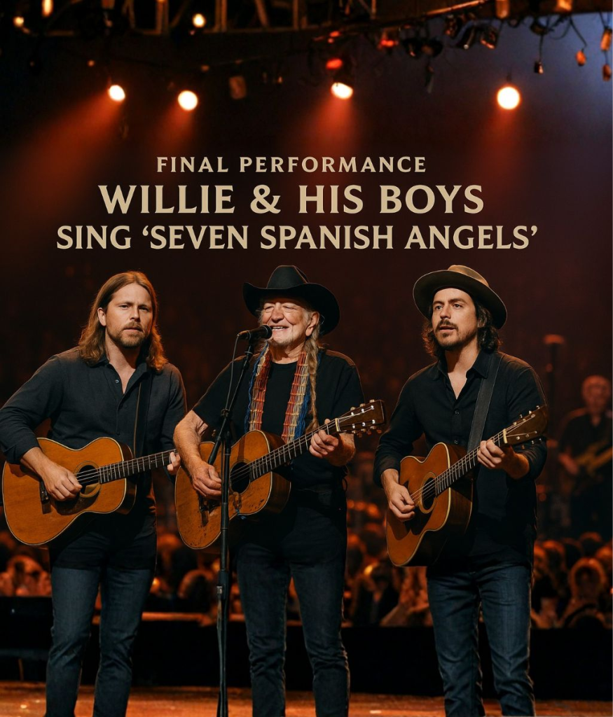 It was the moment no one inside the arena was ready for — the kind of moment that doesn’t just happen in music, but in life. The final performance of Willie Nelson alongside his sons, Lukas and Micah, singing the timeless classic “Seven Spanish Angels.” Long before the first chorus even arrived, people in the audience were already lifting trembling hands to their faces, wiping away tears they didn’t expect to shed so soon.