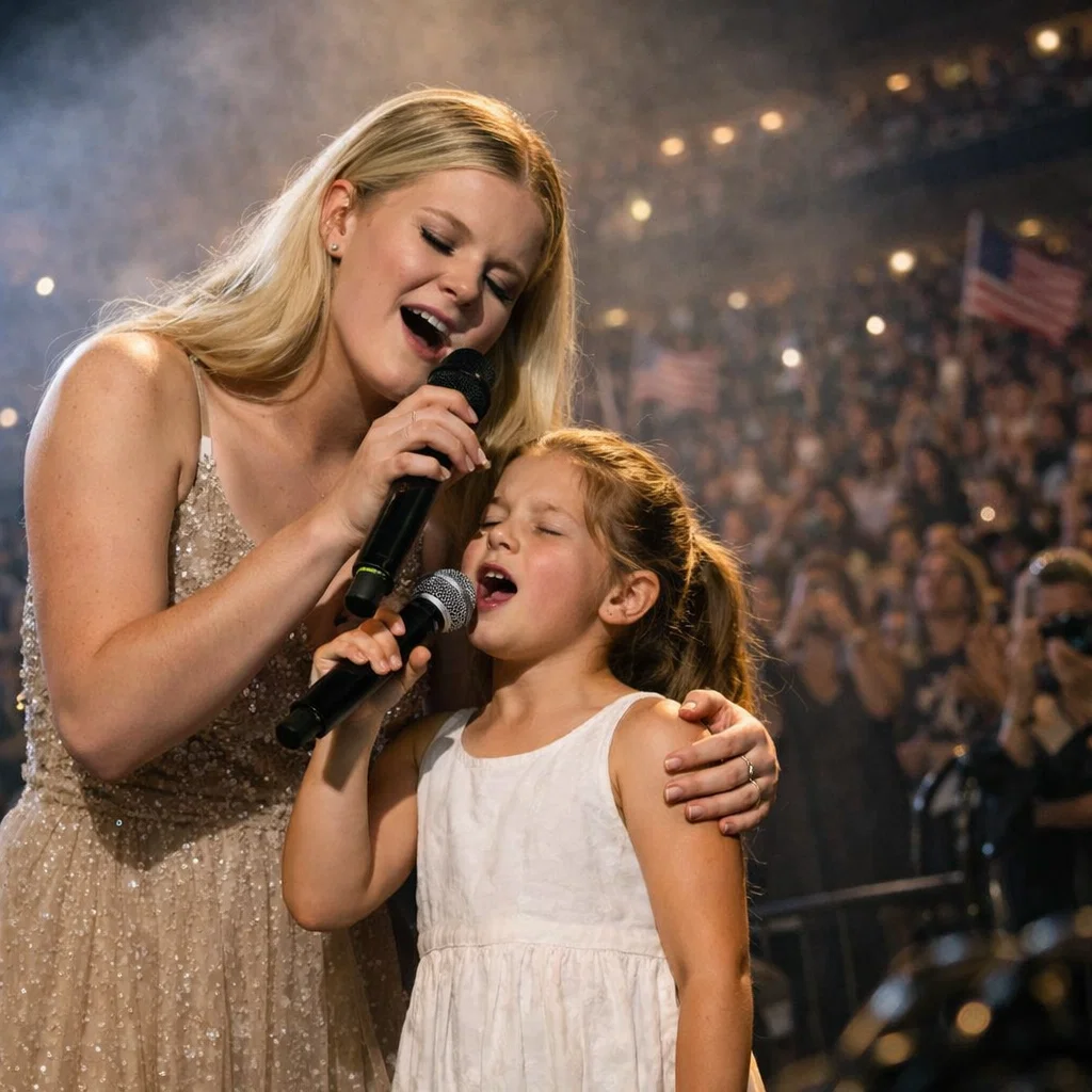 Onstage, under a wash of gentle light, Darci Lynne stood completely still. There was no theatrical entrance, no dramatic buildup. Just presence. One hand wrapped around the microphone, steady but relaxed. The other rested gently near the shoulder of a young girl beside her — her niece.
