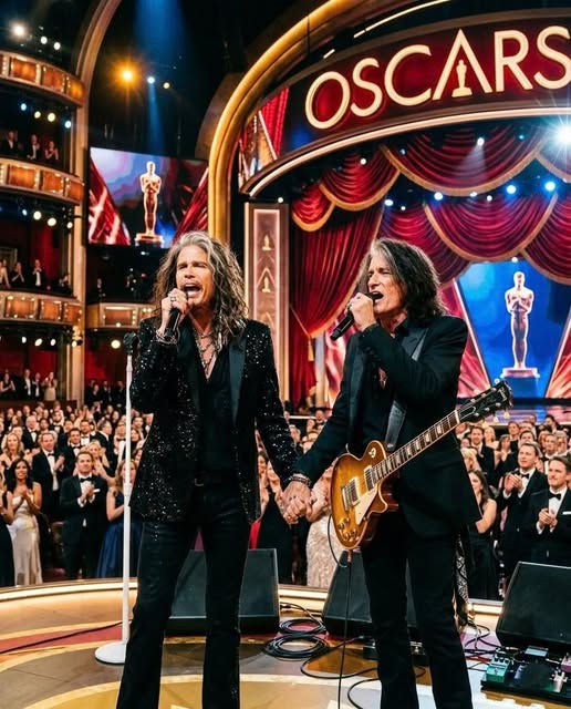 The core of Aerosmith, reunited not in a stadium, not on a tour stage, but at one of the most globally watched events in entertainment.