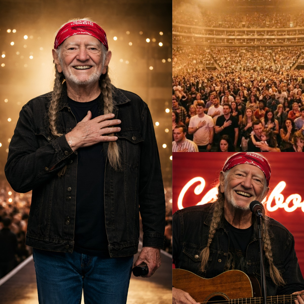 From the stage, Willie looked up. Slowly. He tipped his cowboy hat toward the crowd, a simple gesture loaded with gratitude. Then he placed one hand over his heart, fingers spread as if to hold it together. Tears streamed freely down his face, catching the lights as the chorus carried on without him.