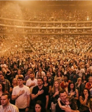 From somewhere high in the upper decks, a single voice rose—clear, earnest, unashamed. Another joined it. Then ten more. Then hundreds. Within seconds, forty thousand people lifted the chorus together, their voices stacking and swelling until the song no longer belonged to the stage.