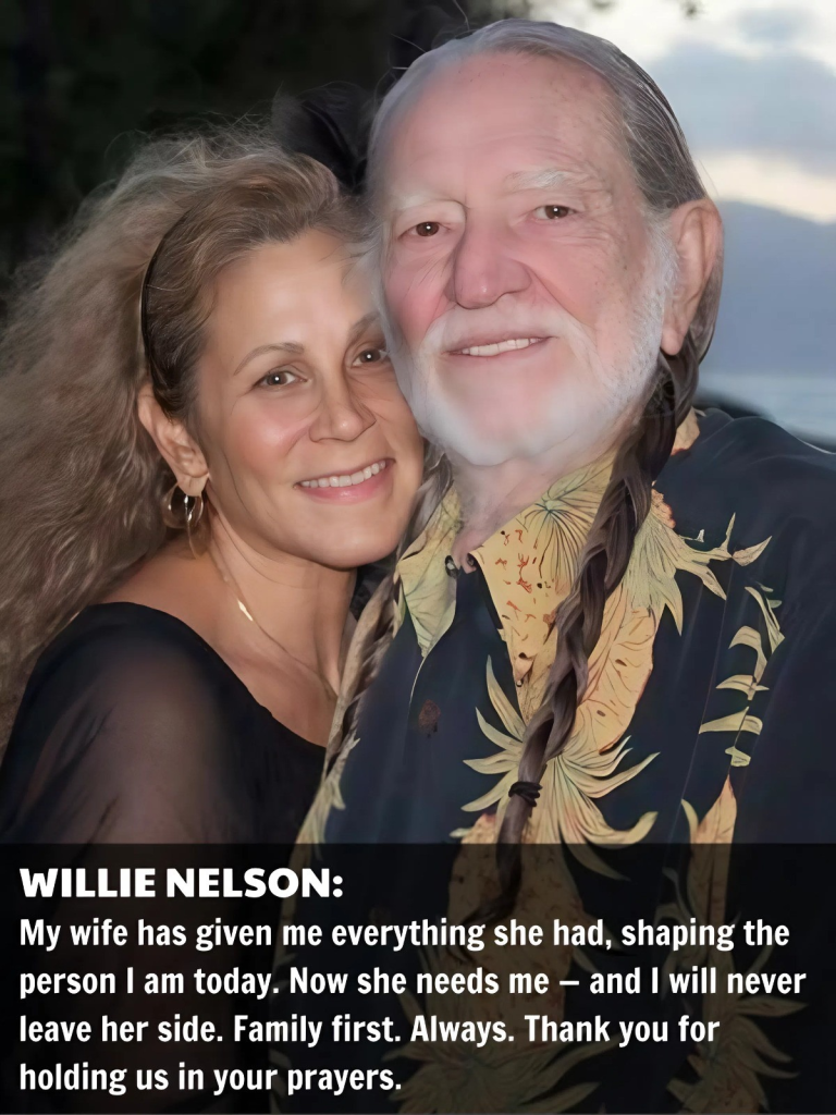 Under the soft glow of gentle lights in a quiet room, Willie Nelson spoke about his wife. His voice—low, unhurried, and worn with emotion—carried the weight of a lifetime shared. There were no flashing cameras, no dramatic headlines waiting to be born. Just a man, a memory, and a love that had outlived decades of roads, songs, storms, and silence. Those who witnessed the moment say it didn’t feel like an interview or a performance. It felt like a confession offered carefully, the way you speak when the truth matters more than applause.