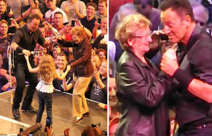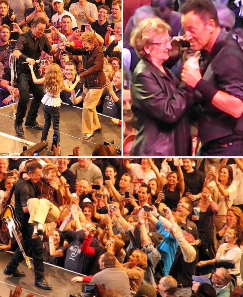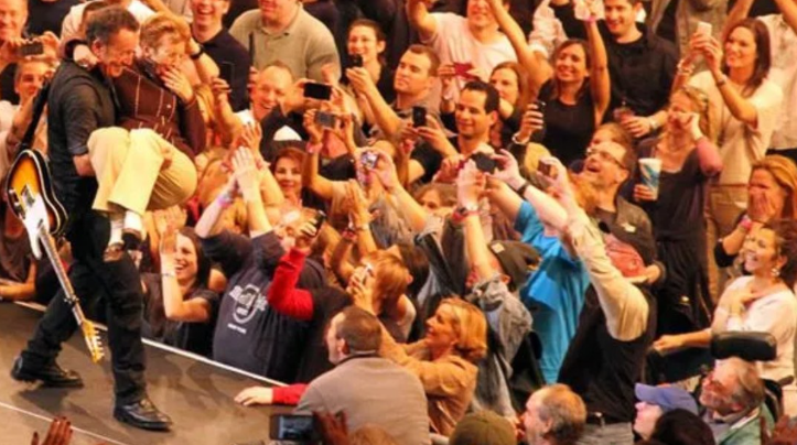 Springsteen waved his hand, signaling the band to pull back. The music softened, then faded. Twenty thousand voices fell into an awed hush. Bruce stepped toward the edge of the stage, reaching down instinctively, as if this were the most natural thing in the world.
