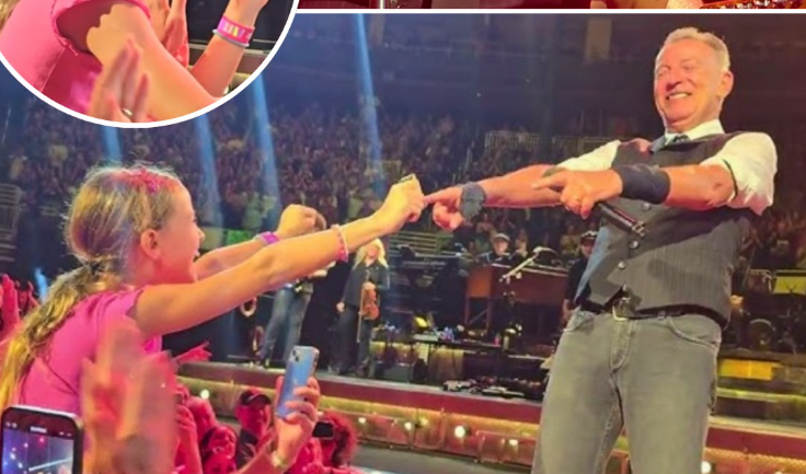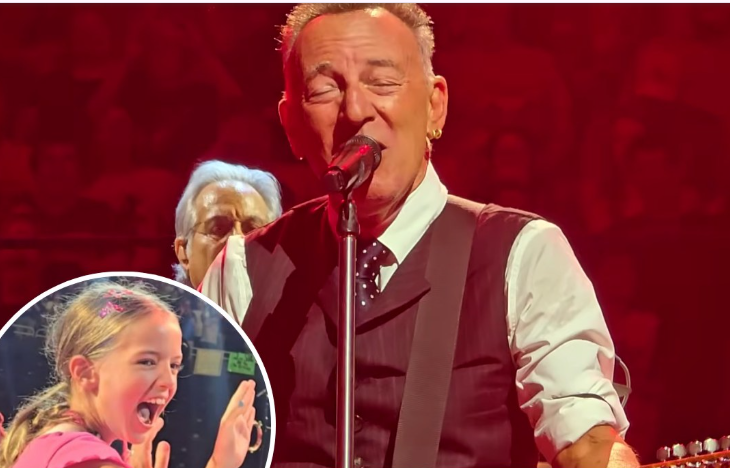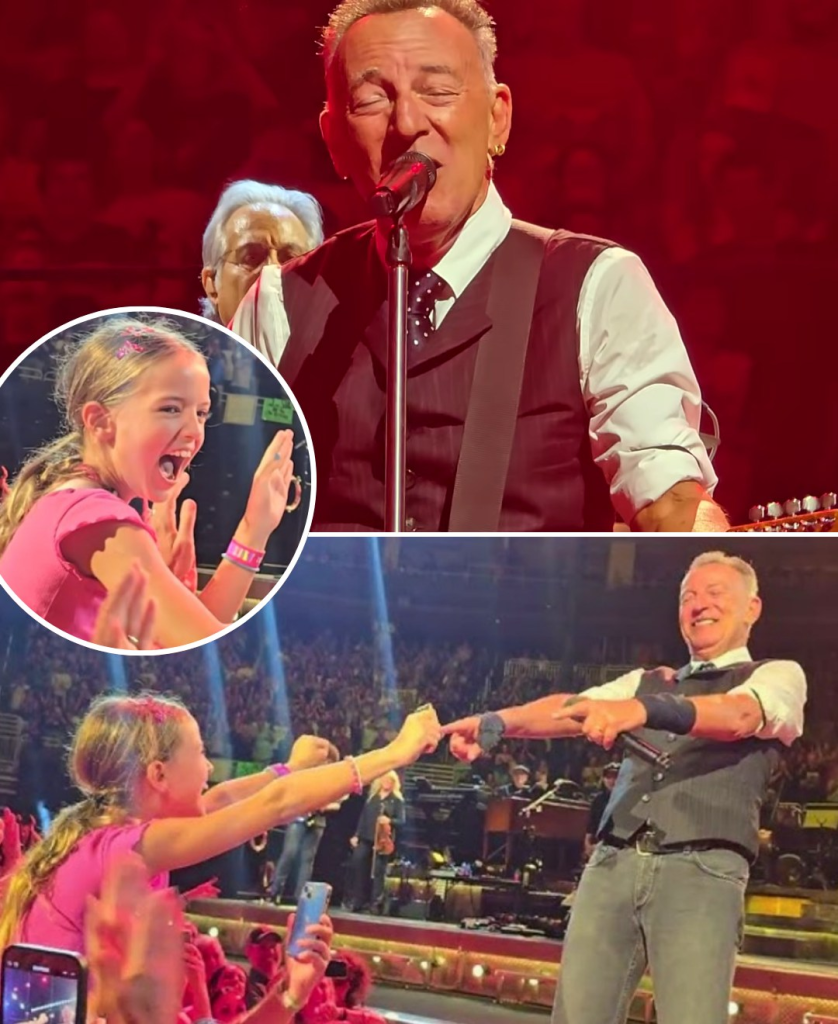 Midway through the song, his gaze locked onto a small figure near the front — a little girl perched high on her father’s shoulders, dwarfed by the towering mass of humanity around her. She couldn’t have been more than seven or eight. She wore an oversized, faded Born to Run T-shirt that hung off her like armor borrowed from another era. Her hair bounced wildly as she sang — not shyly, not half-mouthed, but full-throated, fearless, screaming every lyric like she’d lived them.