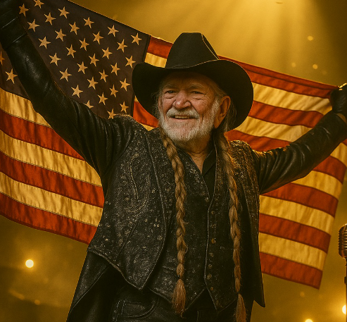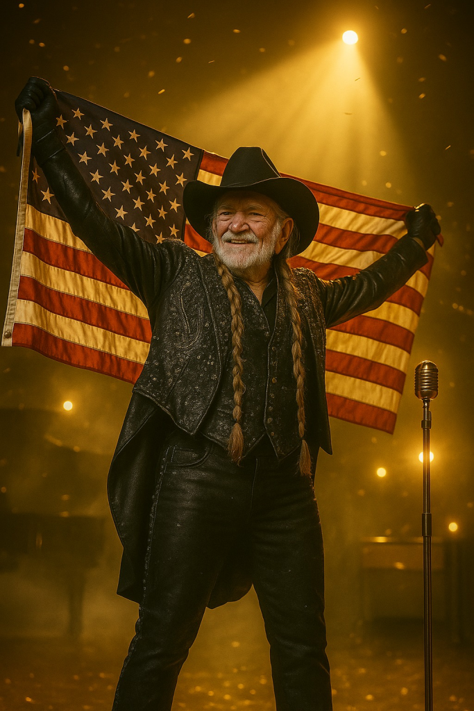 Standing under that flag, his silhouette framed by soft light, Willie Nelson didn’t look like an old man trying to prove anything.