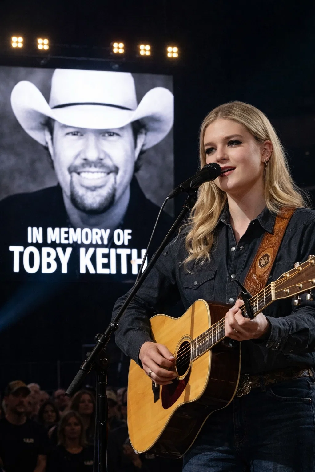 In her hands, she carried something that immediately caught the attention of those close enough to see — Toby Keith’s American flag guitar strap. It wasn’t just an accessory. It was a symbol. A piece of legacy. A quiet signal that this moment was not about performance, but about remembrance.