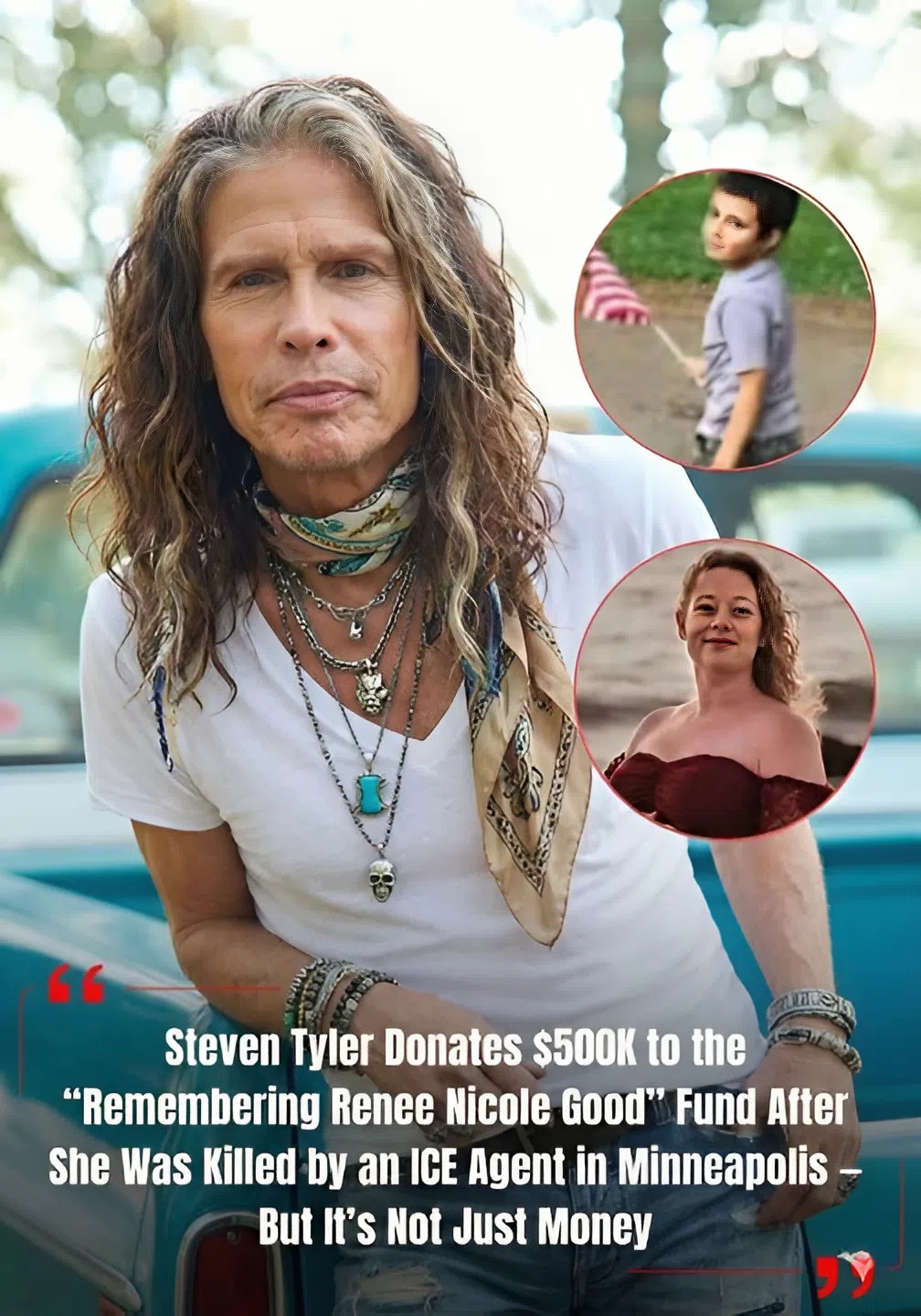 In a gesture that has stunned fans and the nation alike, legendary Aerosmith frontman Steven Tyler has pledged a $500,000 donation to the “Remembering Renee Nicole Good” fund. The fund, established in the wake of the tragic death of Renee Nicole Good, a young mother killed by an ICE agent in Minneapolis, aims to provide financial security and emotional support to her surviving family — most notably her six-year-old son, who has now tragically lost both parents.