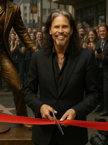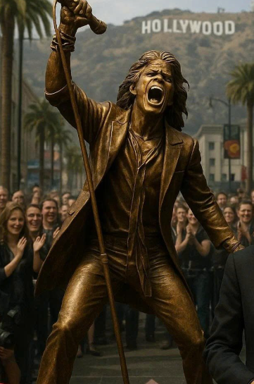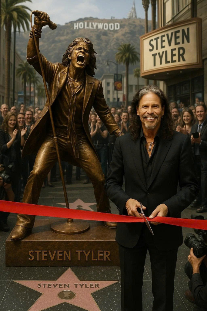 Steven Tyler was sculpted mid-stride, as if stepping straight off a world tour stage and onto the boulevard. His chin was lifted, hair flowing, expression fierce yet vulnerable — that signature blend of showmanship and soul.