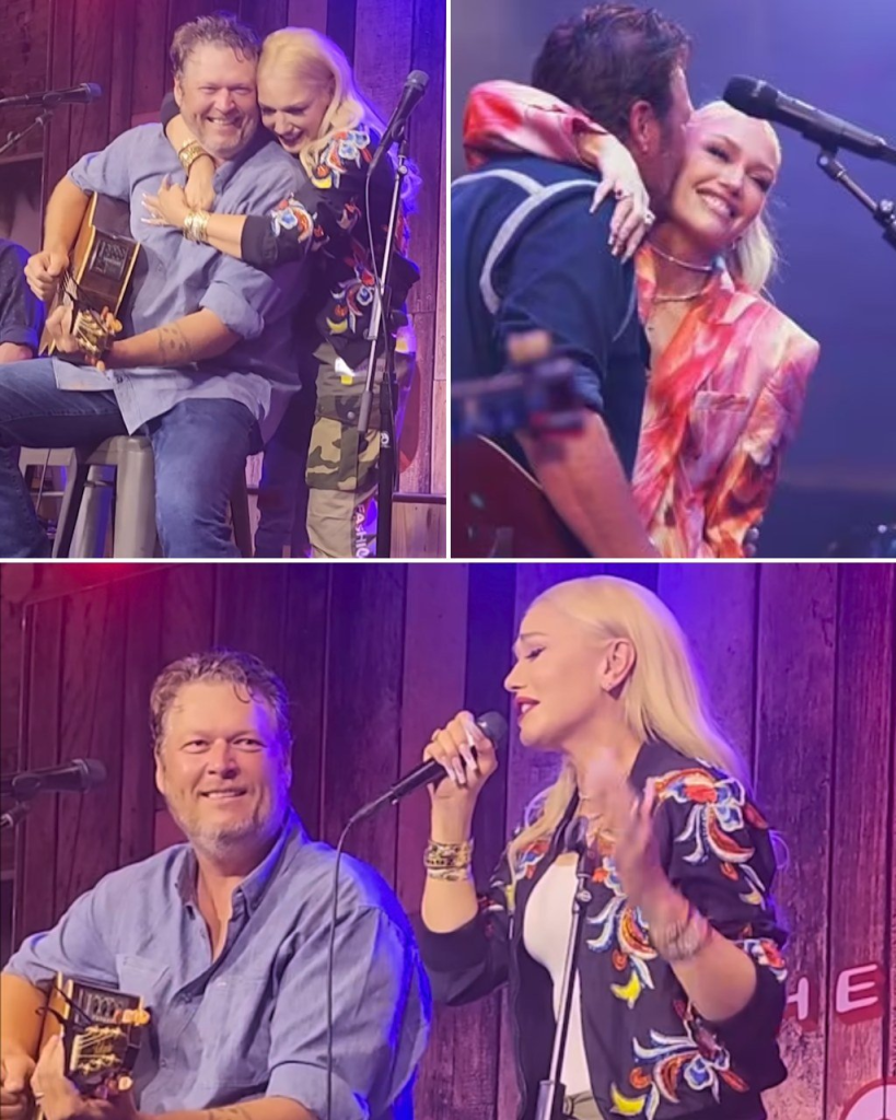 It happened during the chorus, soft and slow, almost subconscious. Blake leaned into a note — eyes closed, jaw tight — and Gwen stepped with him, placing her palm gently on his shoulder.