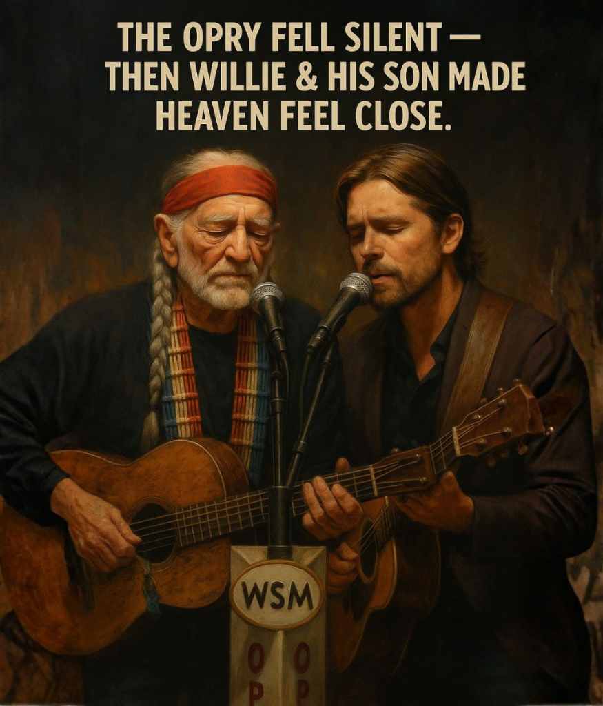 On this night, as Willie Nelson stepped into the famed wooden circle with his son Lukas at his side, the Opry did something it rarely does — it surrendered. The applause that usually greets a legend didn’t swell or roar. It faded. Softly. Respectfully. Almost instinctively. What replaced it was a silence so complete it felt deliberate, as though every soul in the room understood that interruption would be a kind of sacrilege.