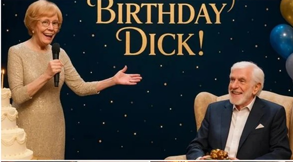 As she finally reached Dick, the cake still blazing, she stopped just short of him, pretending to reconsider the wisdom of her plan. She squinted at the flames, then at him, then back at the flames—milking the moment with the instinct of someone who has spent a lifetime listening to laughter the way musicians listen to music.
