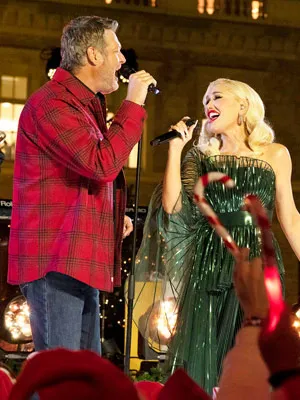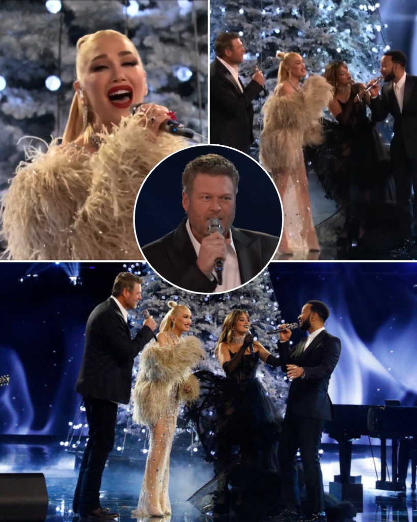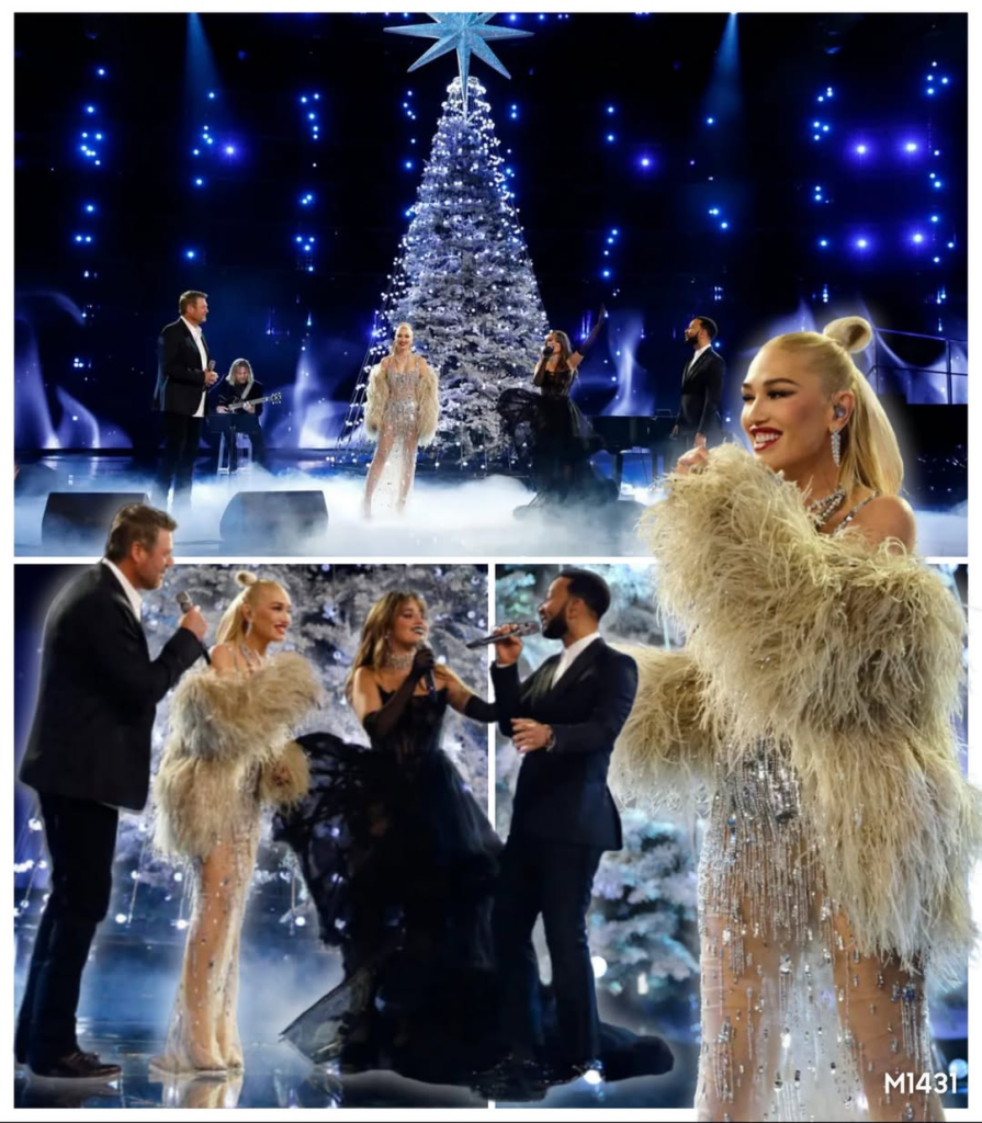 Her voice brought a playful, sparkling energy to the performance—a perfect contrast to Blake’s warmth and the mystery singer’s elegance. With Gwen in the mix, the performance took on a whimsical, modern twist, as if classic Christmas met pop brilliance right in the center of the stage.